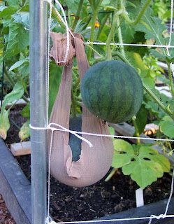 Even though the bottom of the cucumber plants look a little rough, overall, the whole cucumber and watermelon trellis is looking pretty full!